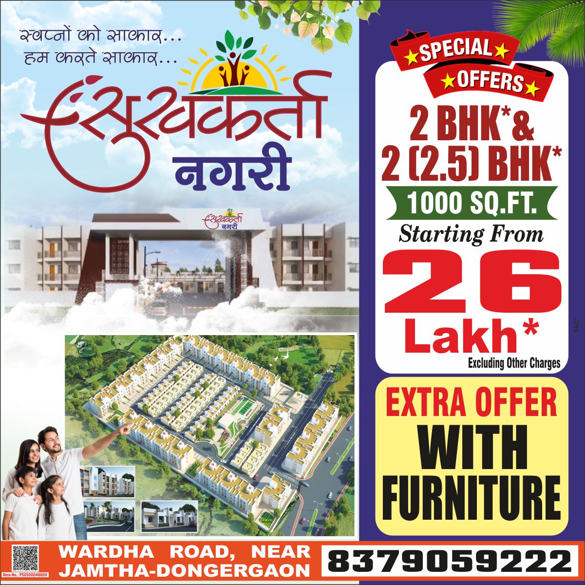 अपने परिवार के सपनों को दें नई उड़ान: सुखकर्ता नगरी, कान्होली में प्रीमियम 2BHK घर एक ऐसे घर में कदम रखें जो आपके साथ बढ़ता है। सुखकर्ता नगरी में हमारे 2BHK अपार्टमेंट्स उन लोगों के लिए बनाए गए हैं जो उत्कृष्टता (Excellence) से कम कुछ भी स्वीकार नहीं करते। तेजी से विकसित होते कान्होली के केंद्र में स्थित, ये घर शहरी आधुनिकता और उपनगरीय शांति का एक बेहतरीन संतुलन हैं। 2BHK का अनुभव: हर सपने के लिए पर्याप्त जगह विशाल लिविंग एरिया: एक चौड़ा और हवादार लिविंग रूम, जो फैमिली मूवी नाइट्स और मेहमानों के स्वागत के लिए एकदम सही है। प्राइवेसी और आराम: अटैच्ड बाथ के साथ मास्टर बेडरूम और एक अन्य बेडरूम—जो बच्चों, माता-पिता या आपके होम ऑफिस के लिए बेस्ट है। घर का दिल (किचन): आधुनिक और विशाल किचन लेआउट, जहाँ काम करना बोझ नहीं, बल्कि आनंद बन जाएगा। धूप से सराबोर बालकनी: बड़ी बालकनी जहाँ से आप मेट्रो सिटी की उभरती हुई खूबसूरती देख सकते हैं—आपकी सुबह की चाय का पसंदीदा कोना। कान्होली: नागपुर का सुनहरा भविष्य 📈 सुखकर्ता नगरी में 2BHK लेना सिर्फ घर खरीदना नहीं, बल्कि भविष्य के लिए एक समझदार निवेश है। काम के करीब: इंडस्ट्रियल और टेक कॉरिडोर के पास होने के कारण ऑफिस जाना होगा अब और भी आसान। शानदार इंफ्रास्ट्रक्चर: आसपास शॉपिंग कॉम्प्लेक्स, प्रतिष्ठित स्कूल और बेहतरीन स्वास्थ्य सुविधाएं। सुरक्षित कम्युनिटी: उन 100+ परिवारों का हिस्सा बनें जिन्होंने इस गेटेड टाउनशिप और 24/7 सुरक्षा को चुना है। “लग्जरी सिर्फ कीमत में नहीं, बल्कि उस सुकून में है जो आपको अपने घर की दहलीज पर कदम रखते ही मिलता है।” प्रोजेक्ट की मुख्य विशेषताएं: कॉन्फ़िगरेशन: 2 बेडरूम + बड़ा हॉल + मॉडुलर किचन स्पेस + 2 बाथरूम + बालकनी। वास्तु सम्मत: सुख-समृद्धि के लिए पूर्व-पश्चिम (East-West) एंट्री के विकल्प उपलब्ध। बेहतर रिटर्न: कान्होली में कीमतें तेजी से बढ़ रही हैं-आज ही अपना 2BHK बुक करें! 🗝️ अपनी नई जिंदग का दरवाजा खोलें! हमारे 'सेंचुरी' (100 बुकिंग्स) के इस सफर का हिस्सा बनें। भव्य उद्घाटन के बाद अब केवल कुछ ही 2BHK यूनिट्स शेष हैं। 📞 साइट विजिट के लिए कॉल करें: 8379059222 💬 WhatsApp: डिजिटल ब्रोशर पाने के लिए “2BHK KANHOLI” लिखकर भेजें। 🌐 अधिक जानकारी: www.sukhkartadevelopers.com
